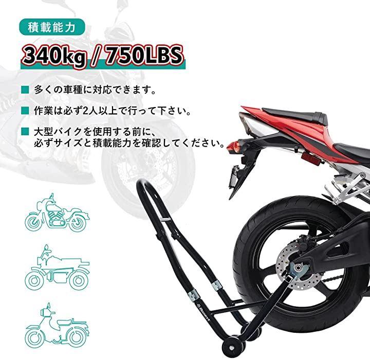 ・「積載能力」優れた積載能力(340kg/750LBS)を持っていますので、オフロードバイク、トライアルバイク、モタードバイクと多くの車種にメンテナンスする時、後輪を上げる時には変形しないように保つことができます。