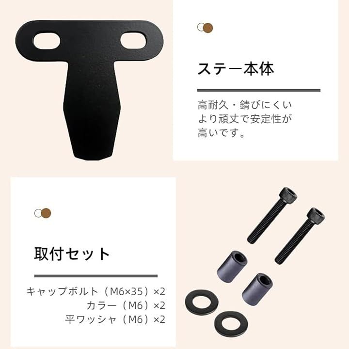 「充実のセット内容」 コントロールスイッチステー本体に、キャップボルト(M6x35)x2、カラーx2、平ワッシャ(M6)x2をセット。