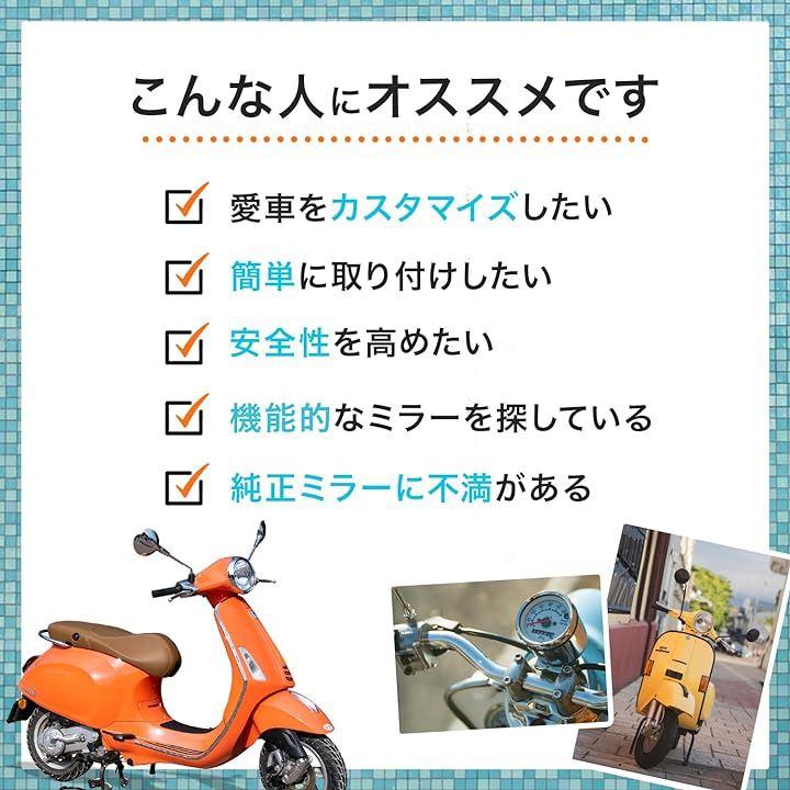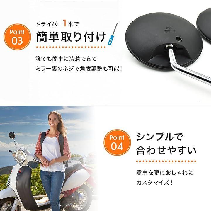 「幅広い視野」ミラー部分は大きめの直径約10cm。小さめミラーもかっこいいですがやはり大きめサイズの方が視界は良好。似た目の良さだけではなく安全運転のサポートにもオススメです。