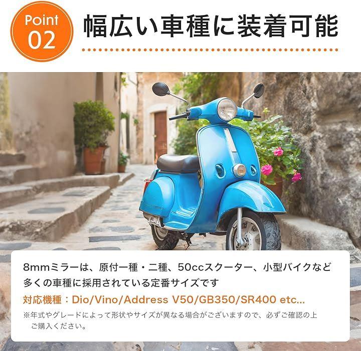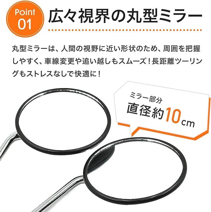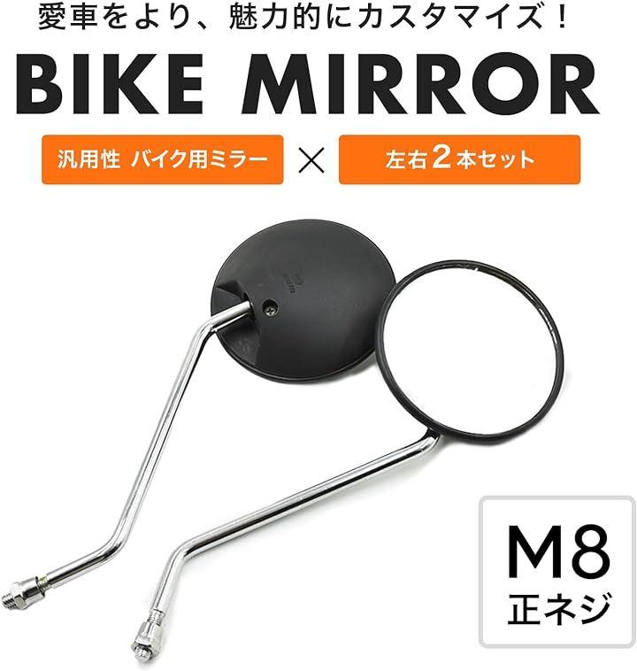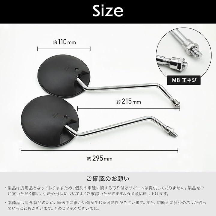 「サイズ」ミラー部分:直径約10cm、「ネジ規格」M8正ネジ(8mm)、「バリエーション」左右2個セットと左右2個セットx2(合計4個)の2種類よりお選びいただけます。