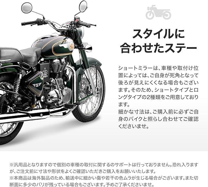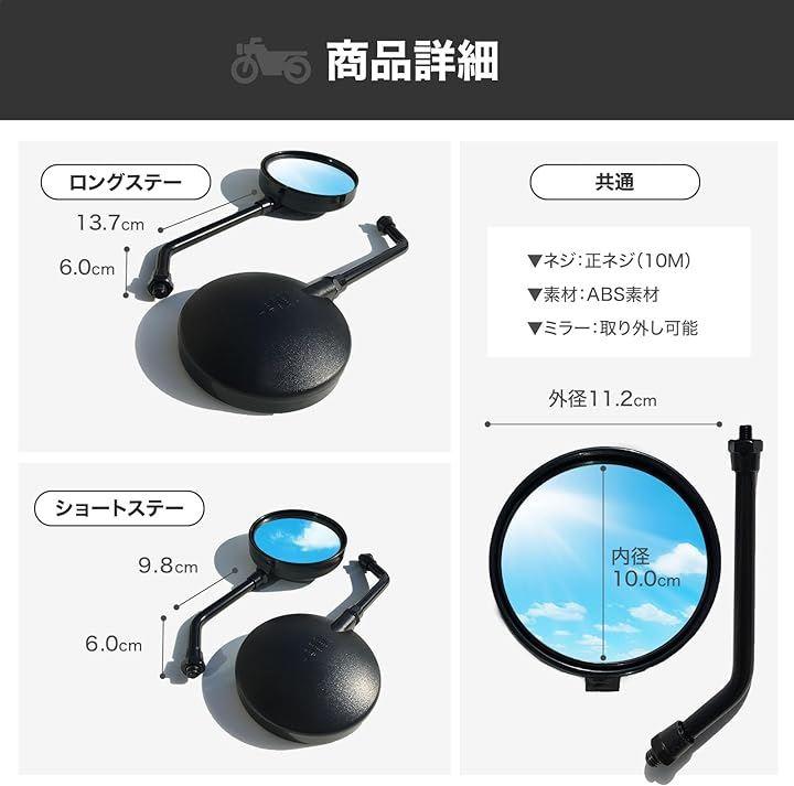 サイズ: ショート ロング共通:(外寸直径 約11.2cm) ショート:(ミラー側から 約9.8cm 約6cm) ロング:(ミラー側から 約13.7cm 約6cm) 共通:( 10mm M10 正ネジ) ミラーとステーは取り外し可能です。