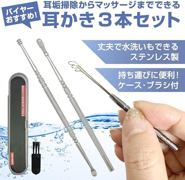ステンレス製耳かき3本セット」耳垢掃除からマッサージまでできる人気のみみかき3本セット。