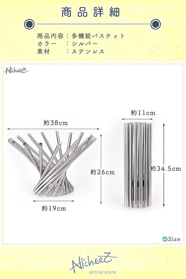 「商品内容」多用途バスケット セット数:1点 素材:ステンレス カラー:シルバー サイズ:開口時バスケットトップ直径/約38cm 開口時ボトム直径/約19cm 開口時高さ/約26cm 収納時高さ/約34.5cm 収納時直径/約11cm