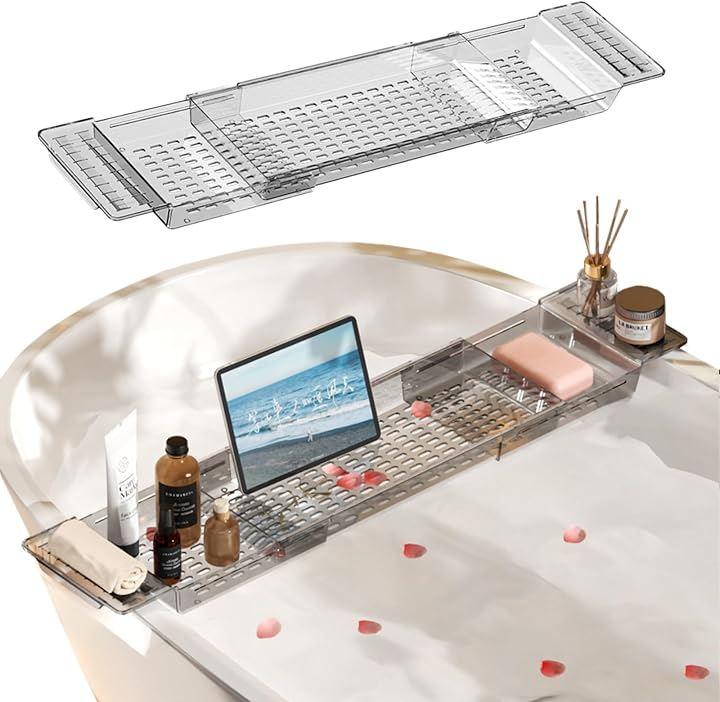 伸縮式で56.5cmから80cmまで調整可能なこの浴槽ラックは、スマートフォンやタブレット、入浴グッズを手元に置けるスペースを提供します。