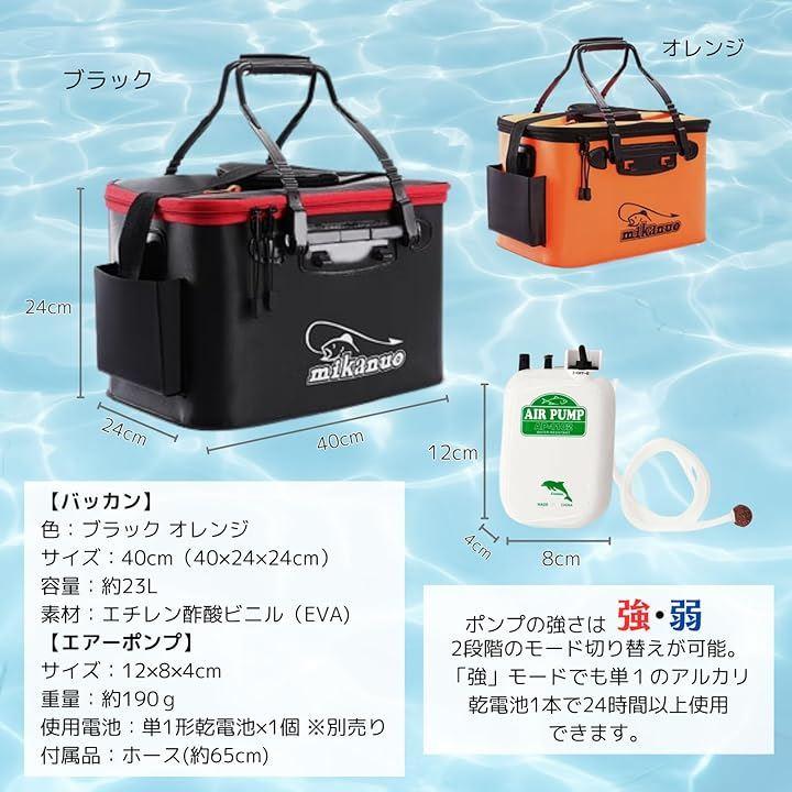 釣りに欠かせないバッカンが新登場。40cmのサイズで23Lの大容量、エアポンプ付きで簡単に魚を活かせます。