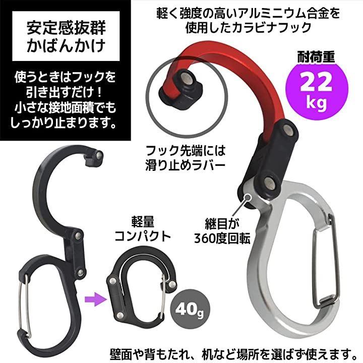 ・飲食店、電車内、トイレ、旅行、登山、キャンプ、ベビーカーなど日常からアウトドア、作業時まで様々なシーンでお使いいただけるコンパクトなバッグハンガーです。