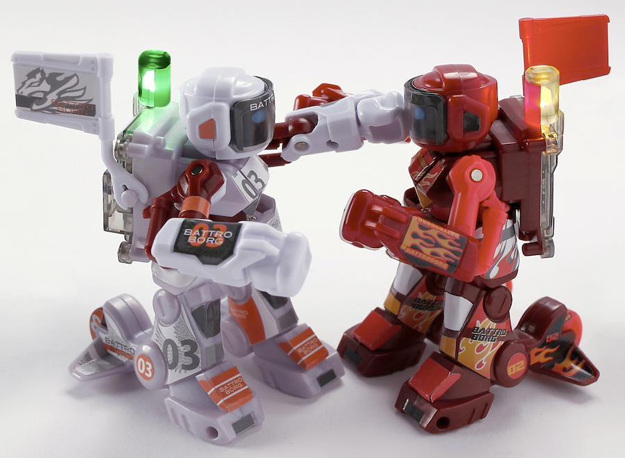 ●ヌンチャク型コントローラーを使ってパンチや前進・旋回ができる超小型高性能バトルロボットです。 ●2人対戦では顔にパンチを受けるとLEDの色が変化し、5発先にパンチを当てたプレイヤーが勝ちです。 ●コントロールに2.4GHzを使用することにより20台同時のロボットバトルが可能。 ●サブゲームとしてスパーリングモードと鬼ごっこモード搭載。