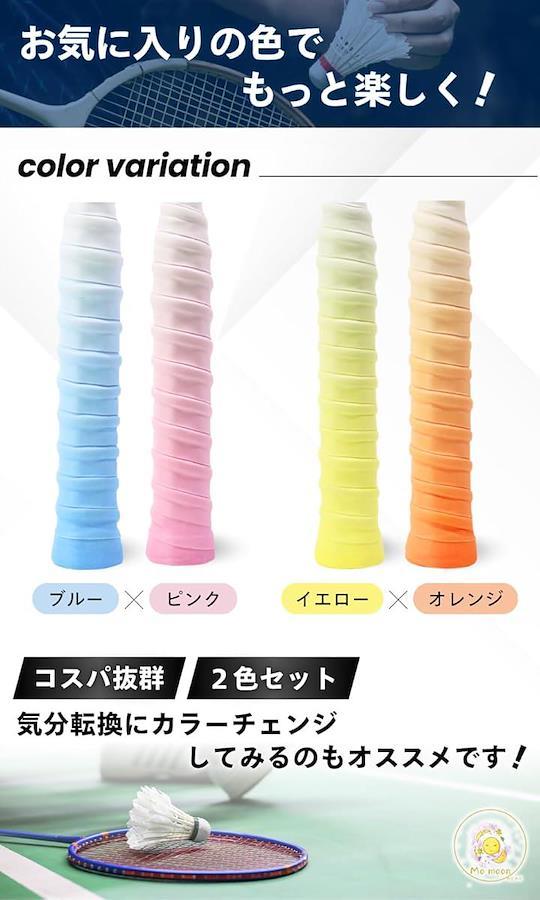 オシャレなグラデーションカラーの2色セットで、ラケットを彩りながらプレーが楽しめるバドミントングリップテープ。