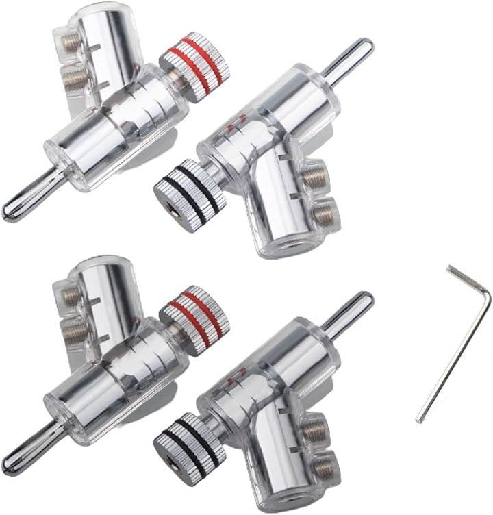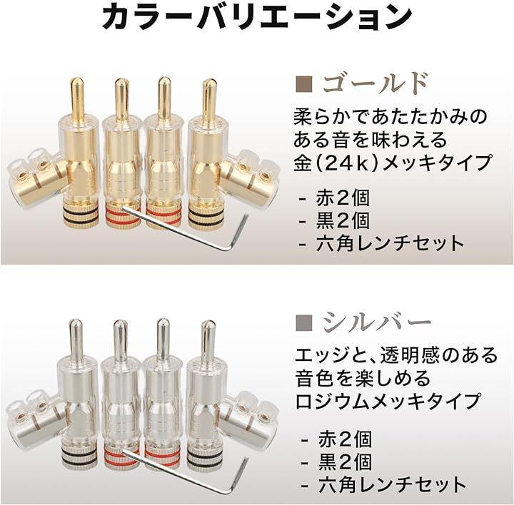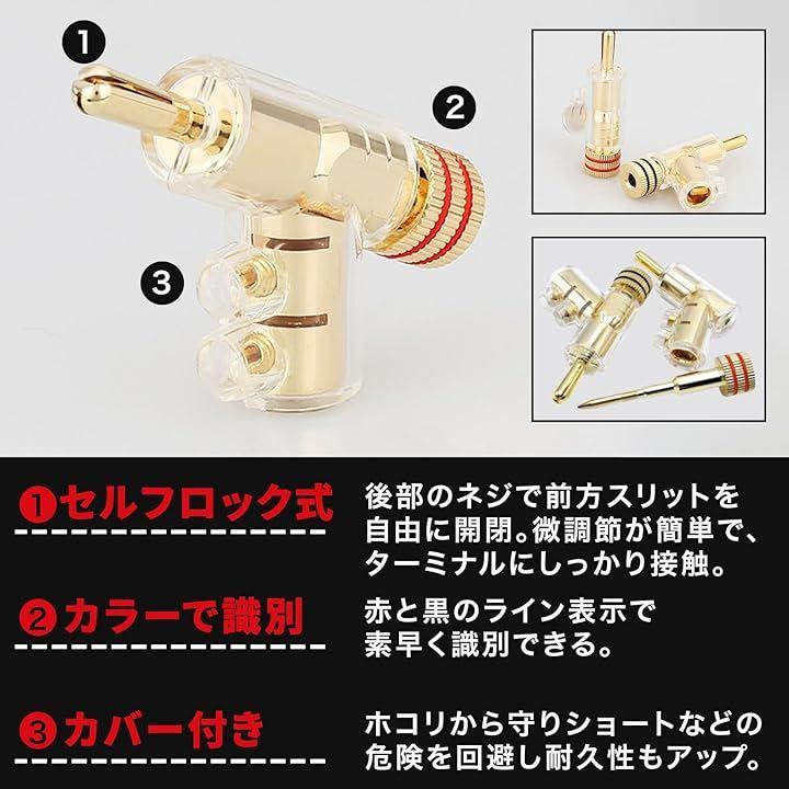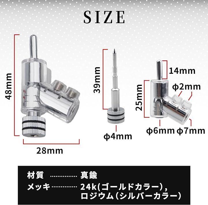 「商品詳細」全体サイズ:約48mmx28mmx12mm|プラグサイズ:4mm|芯線挿入部孔径:約Φ7mm(ネジ2本側)|約Φ4mm(2本ラインネジ側)|材質:真鍮・24kメッキ・ポリカーボネート(PC)
