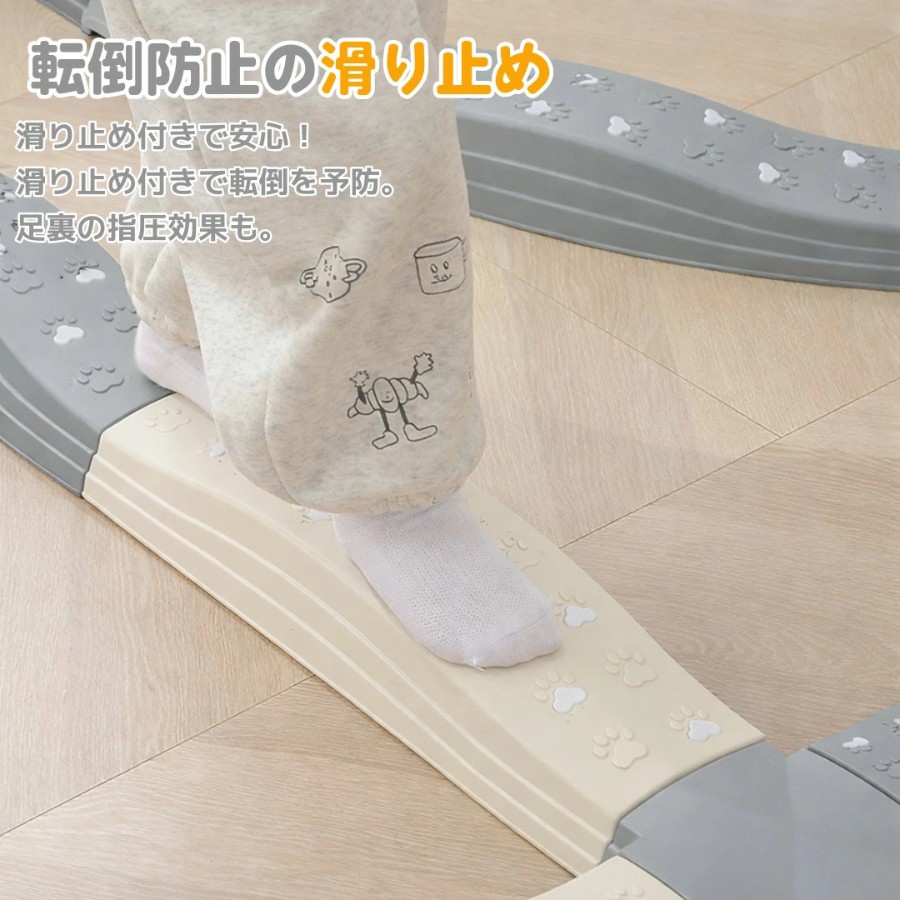 表面には滑り止め加工を施し、転倒リスクを軽減。足裏にほどよい刺激があり、親子でバランス遊びやミニゲームにもおすすめです。