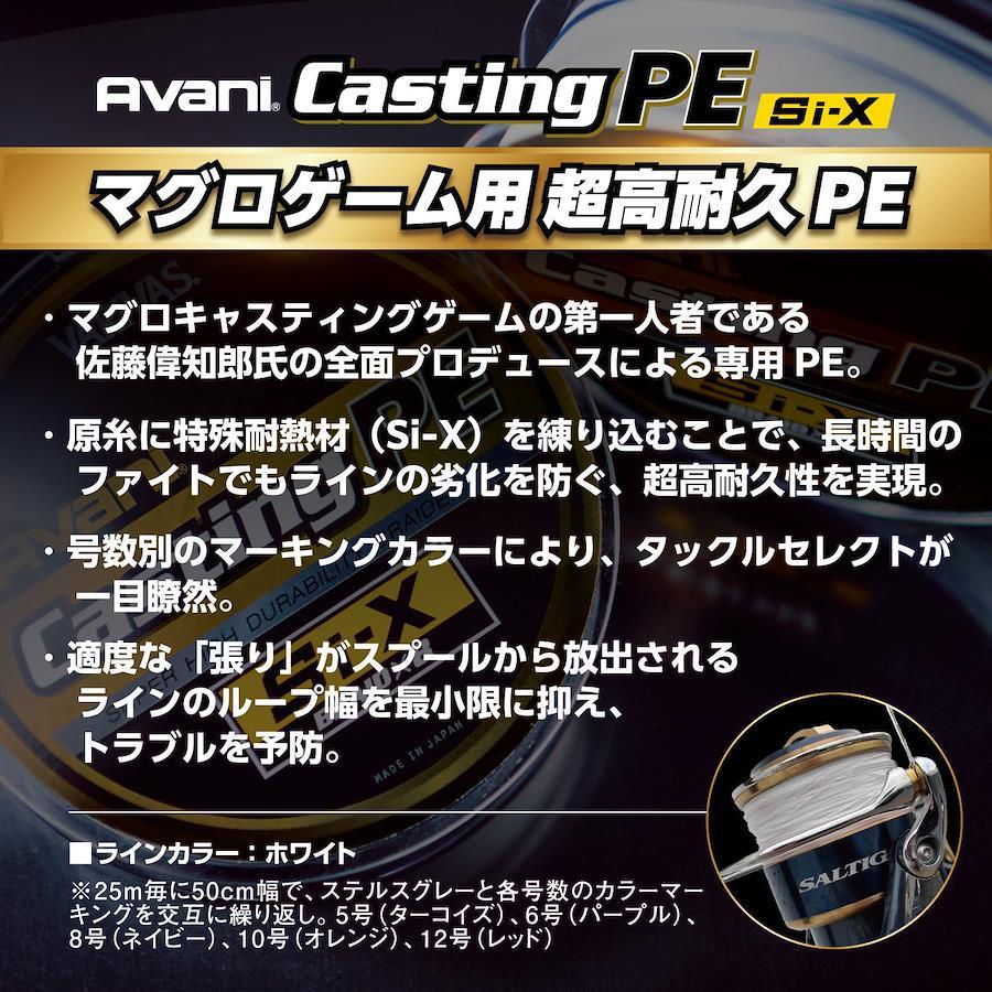 マグロキャスティングゲームの第一人者である佐藤偉知郎氏の全面プロデュースによるマグロキャスティング専用PE。特殊耐熱材(Si-X)が今までに体験したことのない耐久性を実現。PEに特殊耐熱材を練り込むことで大敵である摩擦熱から繊維を守り、ラインブレイクを最大限防ぐ。ラインの「張り」が、スプールから放出されたラインのループ幅を小さくしてトラブルを防ぐ。マーキングカラーを号数別に設定したことで、状況に合わせたタックルをセレクトするのが一目瞭然。