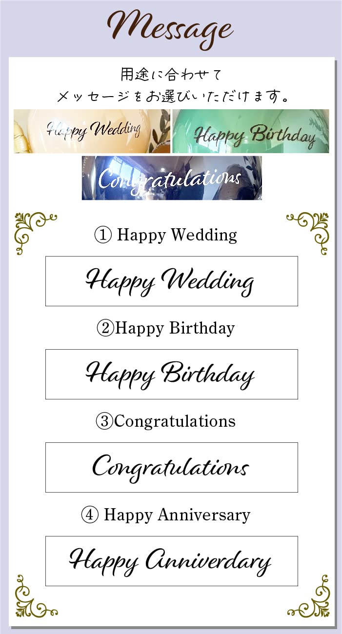 ・当店では明細書や納品書など金額のわかるものは一切同梱しておりません。 ・すべての商品はラッピングされた状態でお送りいたします。 ・メッセージカード(無料)対応しております。 メッセージカードはお好きな内容を備考欄からご入力ください。 合わせてご希望のメッセージカードの番号も記載をお願い致します。 ・お急ぎ発送・お届け日時指定も承ります。 (配送設定からご希望のお日にち・お時間を選択してください) ・【ギフト仕様にするには?】購入時にギフト設定(無料/カートからレジに進む際、「ギフトの設定」にチェック)を行っていただくと、プレゼントとして直送が可能です(明細に金額も掲載されません)。次の画面では、ご希望のメッセージ(無料)や数字バルーンの追加(有料)もお選びいただけます。オプション内容についてもギフトメッセージ欄へご記入をお願い致します。 ・【結婚式場への配送について】結婚式の当日は担当者様もお忙しいため、式の前日に配送指定していただくことをお勧めしております。住所の最後に式の日時、式場名、可能であれば担当プランナー様のお名前の記載をお願い致します。事前に担当プランナー様にご連絡いただく事で、スムーズにお受け取り頂けます。