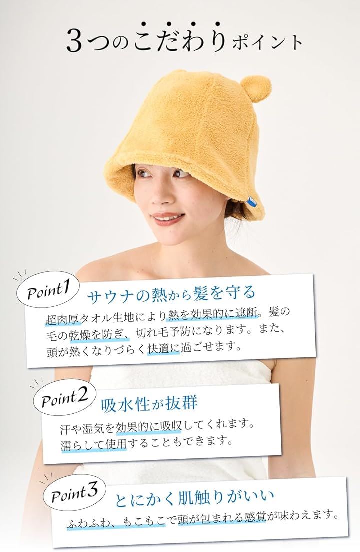 ・「もふもふで可愛い耳つきデザイン」サウナタイムを楽しくする、可愛い耳つきのデザインがポイントです。