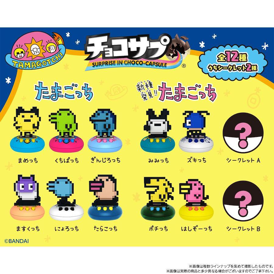 チョコサプシリーズの第3弾に「たまごっち」が登場! ツートンカラーのカプセル型チョコの中には、カラフルドットなミニフィギュアと、たまごっちにそっくりな台座のおまけ入り。 組み立てるとその姿はまるで画面からたまごっちたちが飛び出てきたよう! 机の上でたまごっちの世界観を再現できます! たまごっちたちの足元と台座は共通の形状になっているので、複数買えば自分の好きなミニフィギュアとたまごっちを組み合わせて飾ることもできます! たくさん集めてコレクションするもよし、お気に入りや思い出の組み合わせにするもよし、様々な楽しみ方ができる商品です。 シークレットも2種あります☆彡 何が出てくるかはおたのしみ! ●彩色済みフィギュア+本体型台座:1セット(全12種/うちシークレット2種) 1.まめっち 2.くちぱっち 3.ぎんじろっち 4.ますくっち 5.にょろっち 6.たらこっち 7.みみっち 8.ズキっち 9.ポチっち 10.はしぞーっち 11.シークレットA 12.シークレットB ●準チョコレート20g