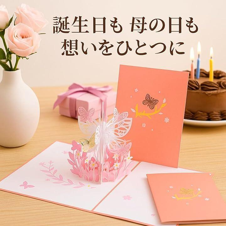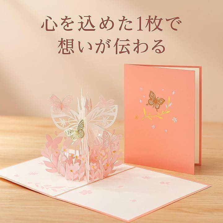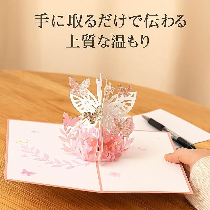 カードを開いた瞬間、繊細な蝶が舞い上がるように広がる立体デザインのバースデーカードです。