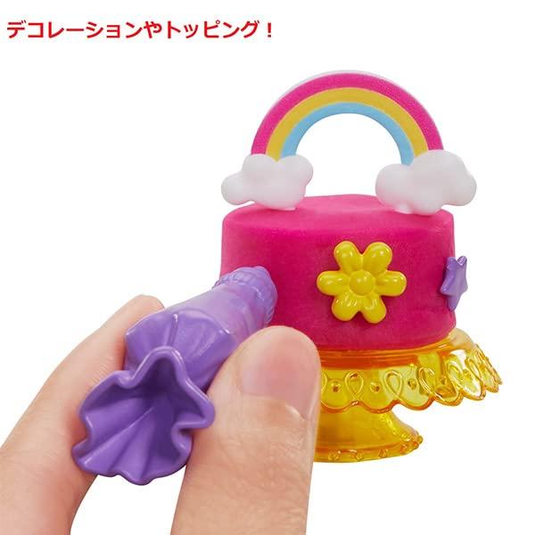 リアルなケーキ作りのために、お子さまは2種類の粘土(ピンクとブルー)を使って、オーブンに入れ、レバーを引いてケーキが盛り上がるのを見ることができます。そして、焼きあがったケーキを作業台にのせ、デコレーションやトッピングをすることで、ケーキのデコレーションも楽しむことができます。