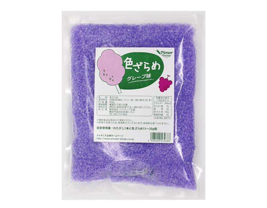 原材料:白双糖(国内製造)、グラニュー糖/香料、着色料(赤3、青1)