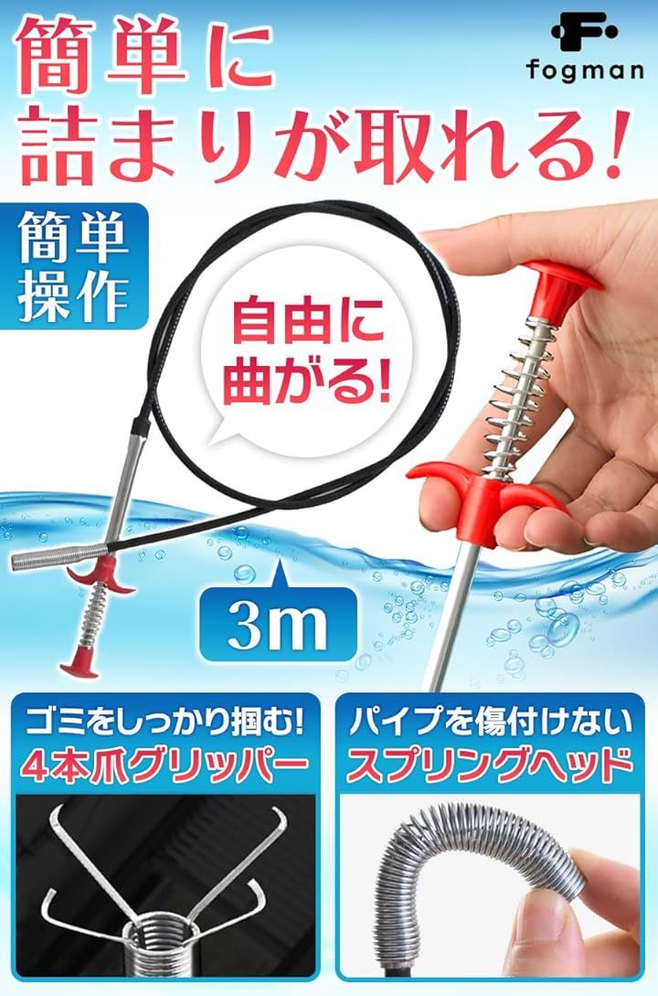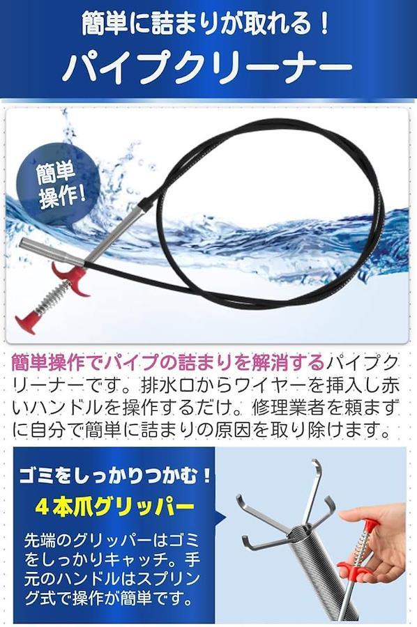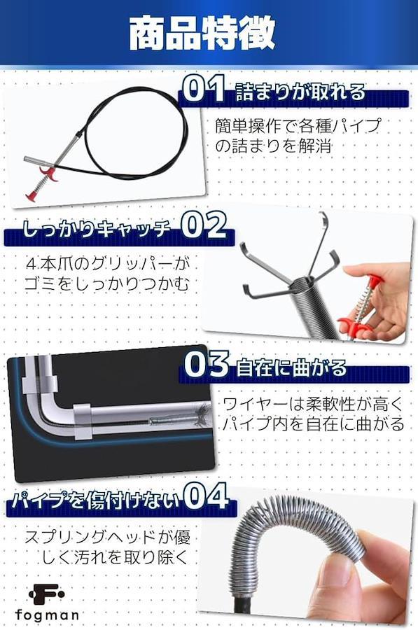 「商品特徴」(1)詰まりが取れる:簡単操作で各種パイプの詰まりを解消/(2)しっかりキャッチ:4本爪のグリッパーがゴミをしっかりつかむ/(3)自在に曲がる:ワイヤーは柔軟性が高くパイプ内を自在に曲がる/(4)パイプを傷付けない:スプリングヘッドが優しく汚れを取り除く