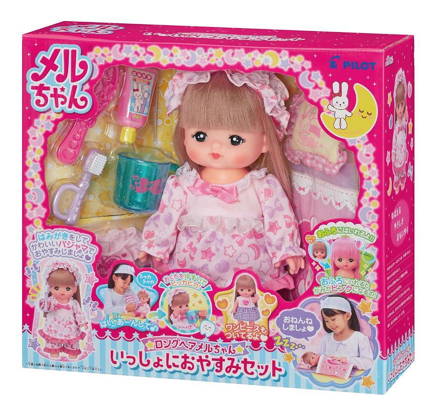 ロングヘアのメルちゃんと「おきがえ」「はみがき」「おねんね」遊びを楽しめるセット。メルちゃんと一緒におねんねしましょ。[セット内容]ロングヘアメルちゃん、パジャマ(上・下)、ヘッドドレス、ワンピース、しきぶとん、おふとん、まくら、はみがきこ、ハブラシ、コップ、くし、ミニブック(.co.jpより) 対象年齢 :3才以上 セット内容:ロングヘアメルちゃん(パンツつき)、パジャマ上下、ヘッドドレス、ワンピース、まくら、かけぶとん、しきふとん、ハブラシ、はみがきこ、コップ、くし、ミニブック メルちゃんと遊びながら一日の習慣を覚えることができます お風呂に入ると髪がピンクになる ロングヘアメルちゃんと「おきがえ」「はみがき」「おねんね」遊びを楽しめるセット