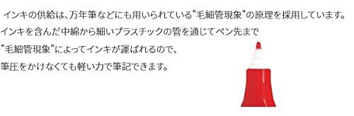 インキの供給は、万年筆などにも用いられている"毛細管現象"の原理を採用しています。インキを含んだ中綿から細いプラスチックの管を通じてペン先まで"毛細管現象"によってインキが運ばれるので、筆圧をかけなくても軽い力で筆記できます。