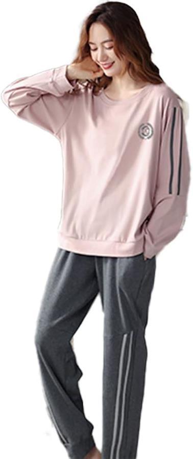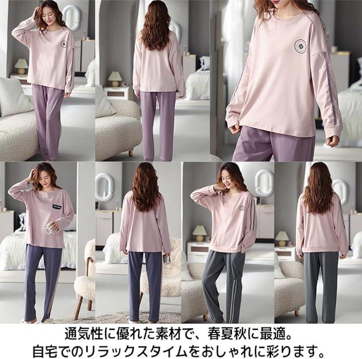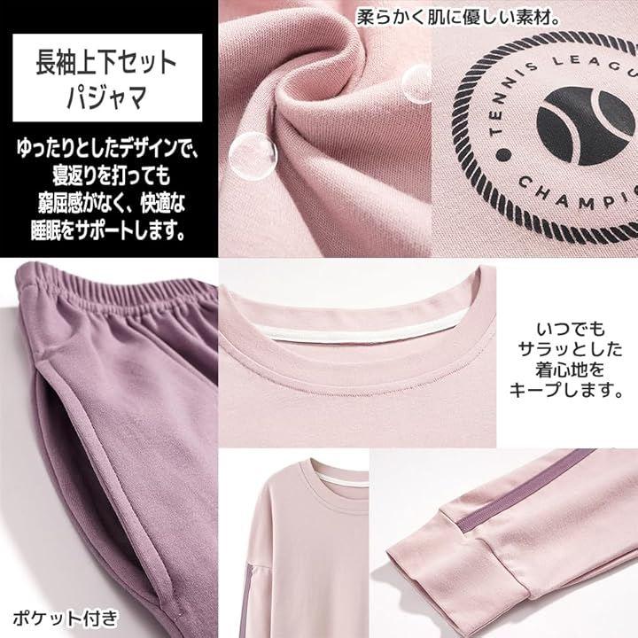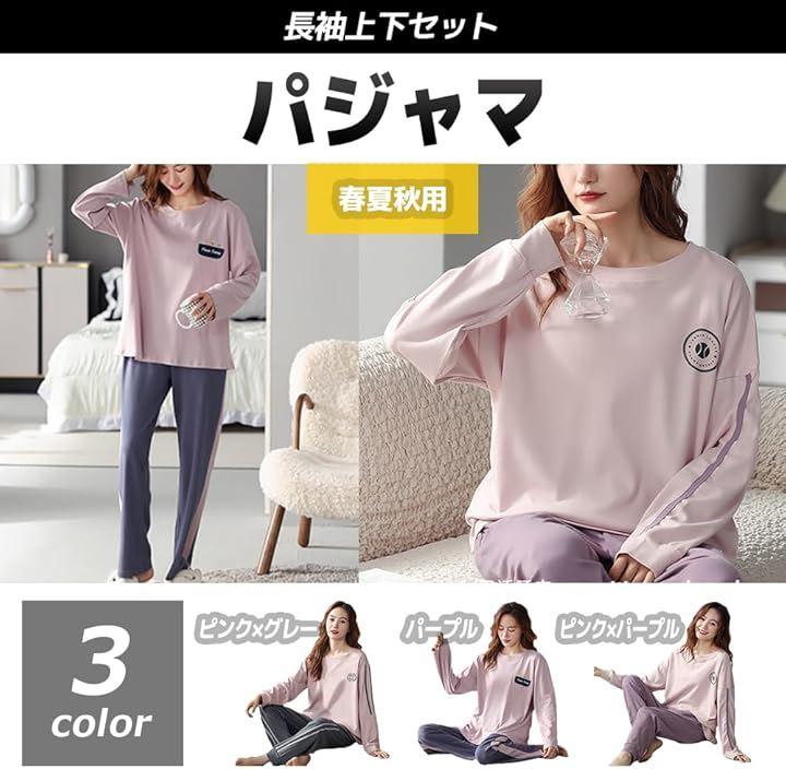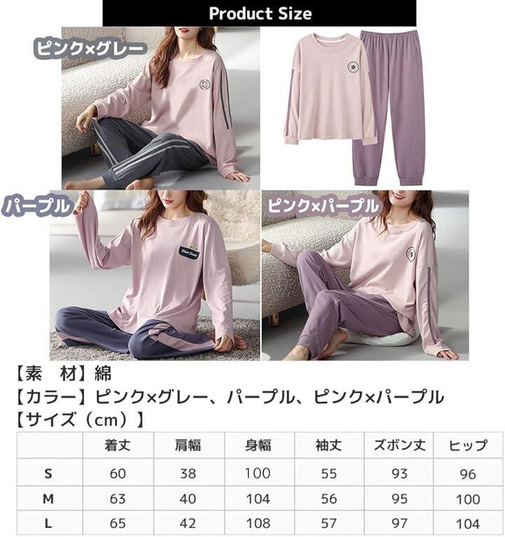 「素材」綿「サイズ」S(着丈60cm 肩幅38cm 身幅100cm 袖丈55cm ズボン丈93cm ヒップ96cm)M(着丈63cm 肩幅40cm 身幅104cm 袖丈56cm ズボン丈95cm ヒップ100cm)、L(着丈65cm 肩幅42cm 身幅108cm 袖丈57cm ズボン丈97cm ヒップ104cm)「カラー」ピンクxグレー、パープル、ピンクxパープル