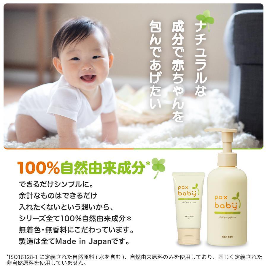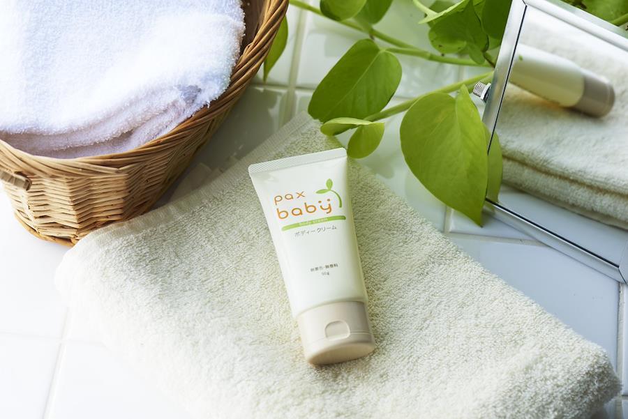 「パックスベビー ボディークリーム(顔・からだ用) 50g」は、赤ちゃんの皮脂にも含まれるパルミトイルオレイン酸を多く含むマカデミアナッツ油を配合したベビークリームです。ベタつかず、伸びの良いクリームです。合成界面活性剤・合成防腐剤等の化学物質を使用せず、石けんで乳化しました。無香料・無着色。使用方法
