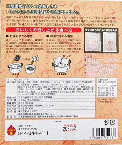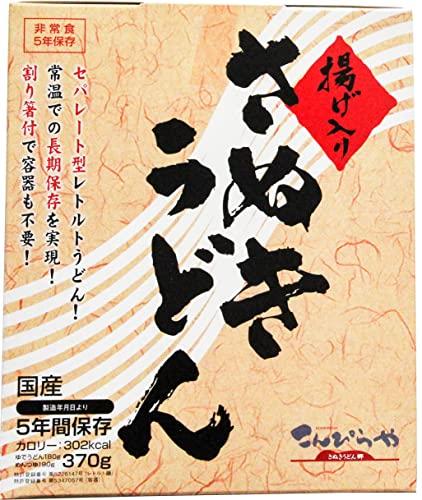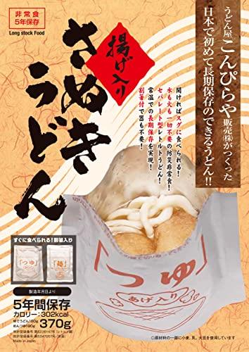 通常1-5営業日で発送●もしもの時のためにどうか備えてください。TBSテレビ番組【マツコの知らない世界】で紹介されました。テーマ【防災グッズの世界】2022年9月6日放送。●YouTubeチャンネル【死なない防災!そなえるTV】で紹介されました。「生麺なのに5年保存!備蓄さぬきうどん・詳細レビュー|非常食を学ぶ」※ご参考ください。★【10食セット】●10,800●10食セットJAN:4549092003545●商品パッケージ:(箱) 約:うどん/135×15×195、●めんつゆ/155×20×200mm ●重量:ゆでうどん:180g ●単品めんつゆ(あげ入):190g ●単品包装サイズ:約165×25×200mm ●原産国:日本【日本製】●付属品:割り箸、つまようじ●商品説明:【非常食】【常温5年保存】非常保存食として、調理不要で『パッケージを開けてすぐに食べられる』【調理】【加熱】【食器】が不要だから【断水】【停電】時でも食べられます。?のど越しが良くお年寄りやお子様でも食べやすいので安心。美味しい食事をコンセプトに作られた、常温で5年間の長期保存を可能にした、めんとつゆのセパレート型レトルトうどんです。独自の製法技術により讃岐うどん本来のコシをそのままに常温で長期保存を実現しました。つゆに麺を入れるだけで、場所を選ばず手軽に食べられます。麺の適度なコシで食べ応えがあり、つゆが喉の渇きを潤します。?もちろん温めると、さらに美味しくお召し上がり頂けます。うどんは北海道産の高品質の小麦粉を使用、ぶっかけつゆも国産大豆醤油をベースに仕上げています。あげは、輸入品の大豆(中国産)を加工したものを使用していますが、遺伝子組み換え大豆は使用していません。●【保存方法】:直射日光を避け、常温保存してください。●原材料名:【めん】小麦粉、植物油脂、コーンスターチ、食塩、こんにゃく粉、醸造酢、ph調整剤、貝殻焼成カルシウム、増粘剤(キサンタンガム)、ソーマチン 【めんつゆ(油揚げ入り)】油揚げ、大豆(遺伝子組換え不分別)、植物油脂、凝固剤、しょうゆ(本醸造)、砂糖、昆布エキス、醸造調味料、食塩、醸造酢、調味料(アミノ酸等)、グリシン、貝殻焼成カルシウム、酢酸ナトリウム、ソーマチン(原材料の一部に小麦、乳、大豆を使用しています)●栄養成分:1食(370g)あたり エネルギー/302kcal たんぱく質/9.8g 脂質/4.4g 炭水化物/56.1g ナトリウム/1.3g (食塩相当料 3.3g)●用途:長期保存備蓄用食料、登山携帯食料、海外携帯食料、ローリングストック、フェーズフリー 他、用途多数。●【ご注意】 ・袋のまま電子レンジでの加熱はお避けください。 ・袋の開封時に、ふちで手を切らないようにご注意ください。 開けにくい時はハサミで切ってください。 ・開封後は、保存できませんので一度で使い切ってください。●製造元:こんぴらや(香川県)、三馬食品(香川県)【備蓄採用実績】官公庁、地方自治体、全国学校関係、全国企業など、多くの団体や組織に【備蓄用非常食】として採用されています。【重要】メーカーによる商品リニューアルに伴いパッケージ(内容量も含む)変更が行われた場合、新パッケージでお届け致します事ご了承願います。