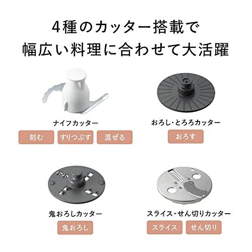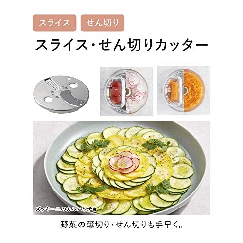 通常1-5営業日で発送:お手入れ性が向上。全パーツ食洗機対応(※) ※本体と付属品のへら付きブラシを除く手間のかかる下ごしらえを簡単・スピーディーに。4種のカッターを搭載刻む・すりつぶす・混ぜる・おろす・鬼おろし・スライス・せん切りまで、下ごしらえがはかどる。時間と手間を賢く省いて、料理に合わせて大活躍。鋭利な刃先で、鋭い切れ味。ステンレス製ナイフカッター付属品: ナイフカッター, おろし・とろろカッター, 鬼おろしカッター, スライス・せん切りカッター, へら付きブラシ, カッター洗浄カバーふた, カッター洗浄カバー