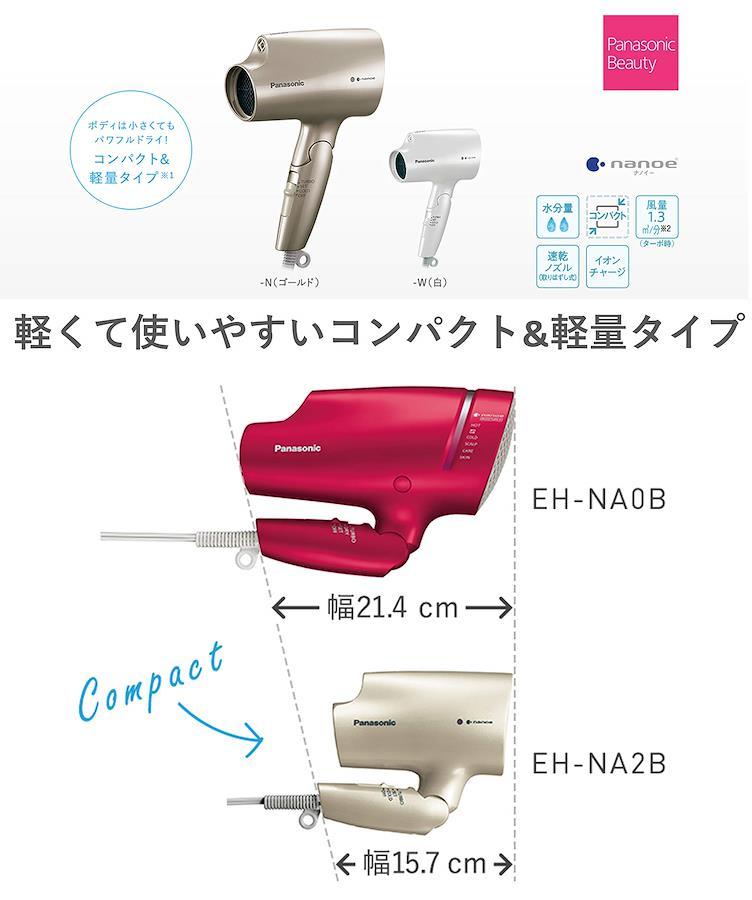 商品紹介コンパクトでも「ナノイー」で、 美しく健やかな髪と地肌へ。「ナノイー」で髪のうねりを整え、なめらかな指通り&うるおい地肌へ。軽くて使いやすいコンパクトサイズ。付属の速乾ノズルで毛束をほぐし、スピーディに乾燥。※1ノズル装着なしの時ご注意(免責)>必ずお読みください【パナソニック製品の修理に関するお問い合わせ】パナソニック修理ご相談窓口 TEL:0120-878-554受付時間:9:00~19:00 (日祝日及び年末年始9:00~17:30)インターネットより「パナソニック修理」で検索