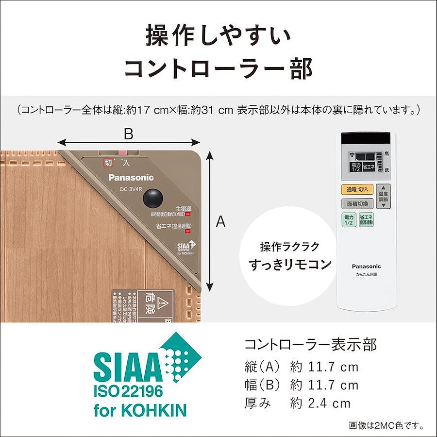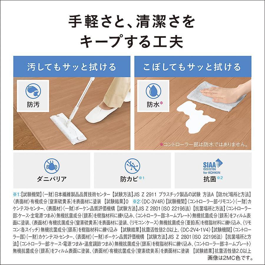 商品紹介お掃除かんたん! (防水*・抗菌(※《3V4R》【試験機関】〈コントローラー部・リモコン〉(一財)カケンテストセンター、〈表面材〉(一財)ボーケン品質評価機構【試験方法】JIS Z 2801(ISO22196法)【抗菌方法と場所】〈コントローラー部〉ケース・主電源つまみ:無機抗菌成分(銀系)を樹脂材料に練り込み/ネームプレート:無機抗菌成分(銀系)をフィルム表面に塗装、〈表面材〉有機抗菌成分(窒素硫黄系)を表面材に塗装、〈リモコン〉ケース:無機抗菌成分(亜鉛系)を樹脂材料に練り込み/各スイッチ:無機抗菌成分(銀系)を樹脂材料に練り込み【試験結果】抗菌活性値2.0以上、《2V4・1V4》【試験機関】〈コントローラー部〉(一財)カケンテストセンター、〈表面材〉(一財)ボーケン品質評価機構【試験方法】JIS Z 2801(ISO22196法)【抗菌方法と場所】〈コントローラー部〉ケース・電源つまみ・温度調節つまみ:無機抗菌成分(銀系)を樹脂材料に練り込み/ネームプレート:無機抗菌成分(銀系)をフィルム表面に塗装、〈表面材〉有機抗菌成分(窒素硫黄系)を表面材に塗装【試験結果】抗菌活性値2.0以上※)・防カビ(※【試験機関】(一財)日本繊維製品品質技術センター【試験方法】JIS Z 2911プラスチック製品の試験方法A【防カビ方法と場所】有機成分(窒素硫黄系)を表面材に塗装【試験結果】0※)・防汚・ダニバリア) *コントローラー部は防水ではありません2面切り替え3通り暖房。消費電力量約30%省エネ(※パナソニック独自の試験条件による評価。外気温5℃、室内温度23℃、フローリング、設定温度「中」設定で通常安定後1時間あたりの消費電力量を測定。〈V4Rシリーズ〉DC-3V4R省エネモード=283Wh、DC-3G1通常モード(省エネモード搭載なし)=421Whとの比較、〈V4シリーズ〉DC-2V4省エネモード=160Wh、DC-2F1通常モード(省エネモード搭載なし)=275Whとの比較、〈1V4〉DC-1V4省エネモード=80Wh、DC-1F1通常モード(省エネモード搭載なし)=123Whとの比較。※)(省エネモード時)。待機電力ゼロ。2面切り換え・ひかえめモード・遮音・外せるコード・切り忘れ防止ご注意(免責)>必ずお読みください【パナソニック製品の修理に関するお問い合わせ】パナソニック修理ご相談窓口 TEL:0120-878-554受付時間:9:00~19:00 (日祝日及び年末年始9:00~17:30)インターネットより「パナソニック修理」で検索
