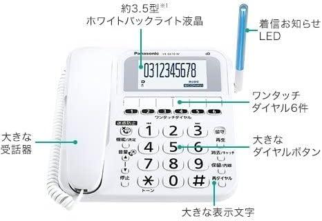●パナソニック VE-E10DL-W デジタルコードレス電話機(子機1台) ホワイト●パナソニック コードレスホン VE-E10DL-W●色名称 ホワイト●商品名称 コードレス電話機(子機1台付き)●発売年月日 2016年09月14日●本体寸法:73mm*190mm*203mm(650g) 高さ*幅*奥行き(質量)●大きなボタンとワンタッチダイヤルで使いやすい●親機の受話音量を従来よりも大きな音に調整可能●着信音が鳴る前にメッセージをアナウンス「迷惑防止」●大きなボタンとワンタッチダイヤル(6件)で使いやすいデザイン(*着信を光ってお知らせする「着信お知らせLED」も搭載)●大きなダイヤルボタン使いやすい大きなダイヤルボタン。●文字も大きく数字が見やすくなっています。●約3.5型1特大数字ホワイトバックライト液晶・・