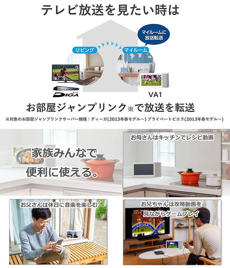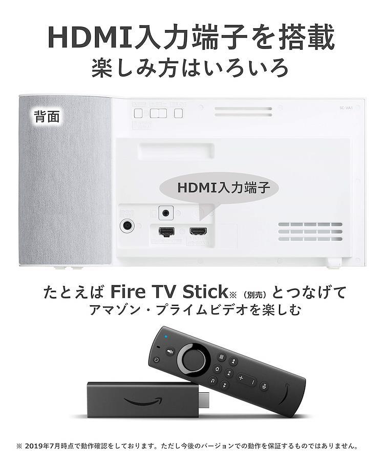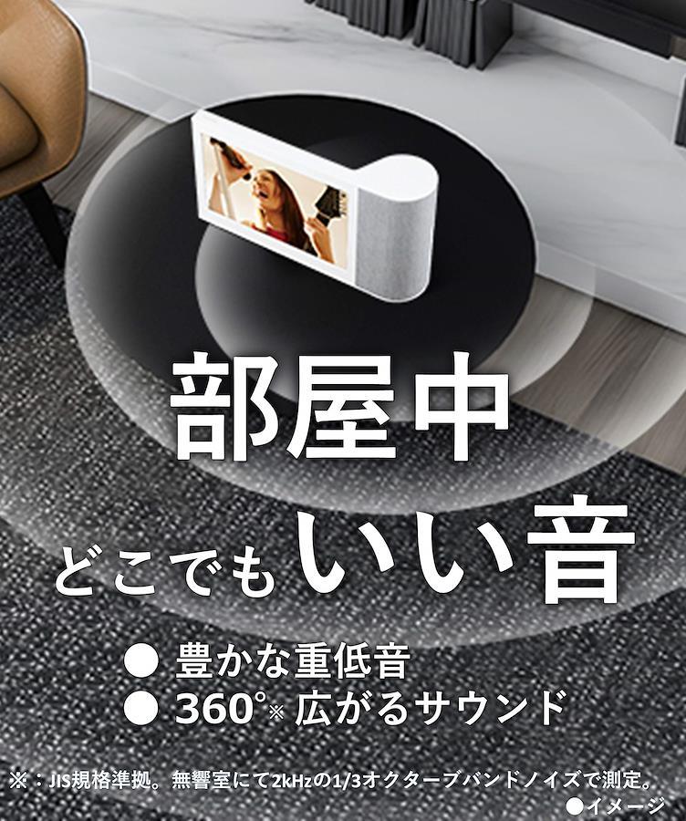 円筒形のスピーカー部は独自形状の「ディフューザー」搭載で、音を部屋中に広げ、室内のどこにいてもいい音を楽しむことができ、さらにディスプレイの背面空間を利用し「ロン