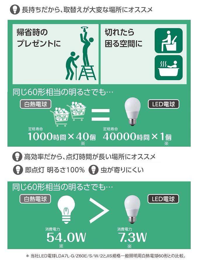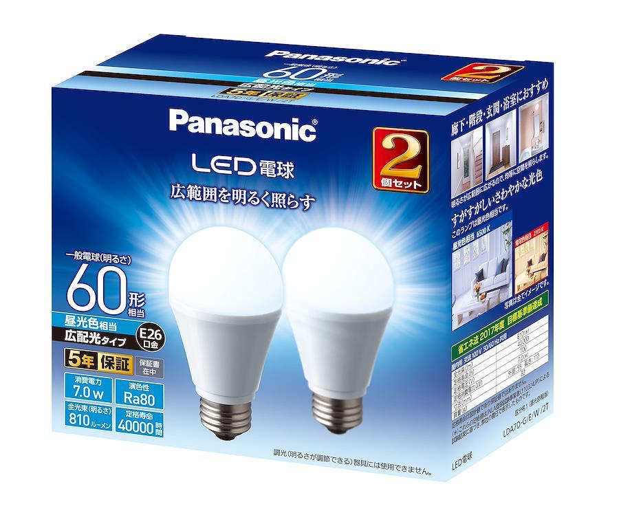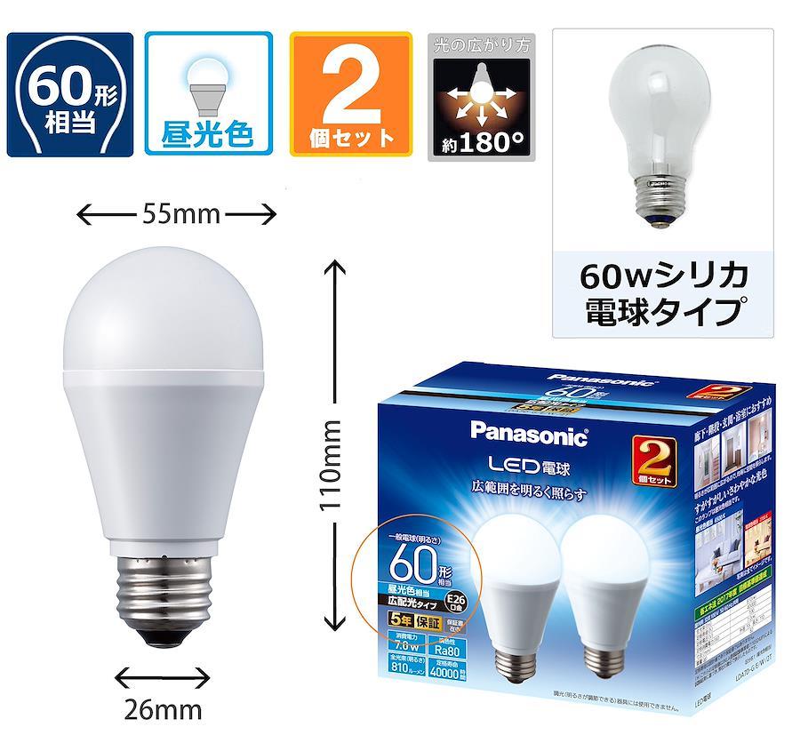 パナソニック LED電球 口金直径26mm 電球60W形相当 昼光色相当(7.0W) 一般電球・広配光タイプ 2個入り