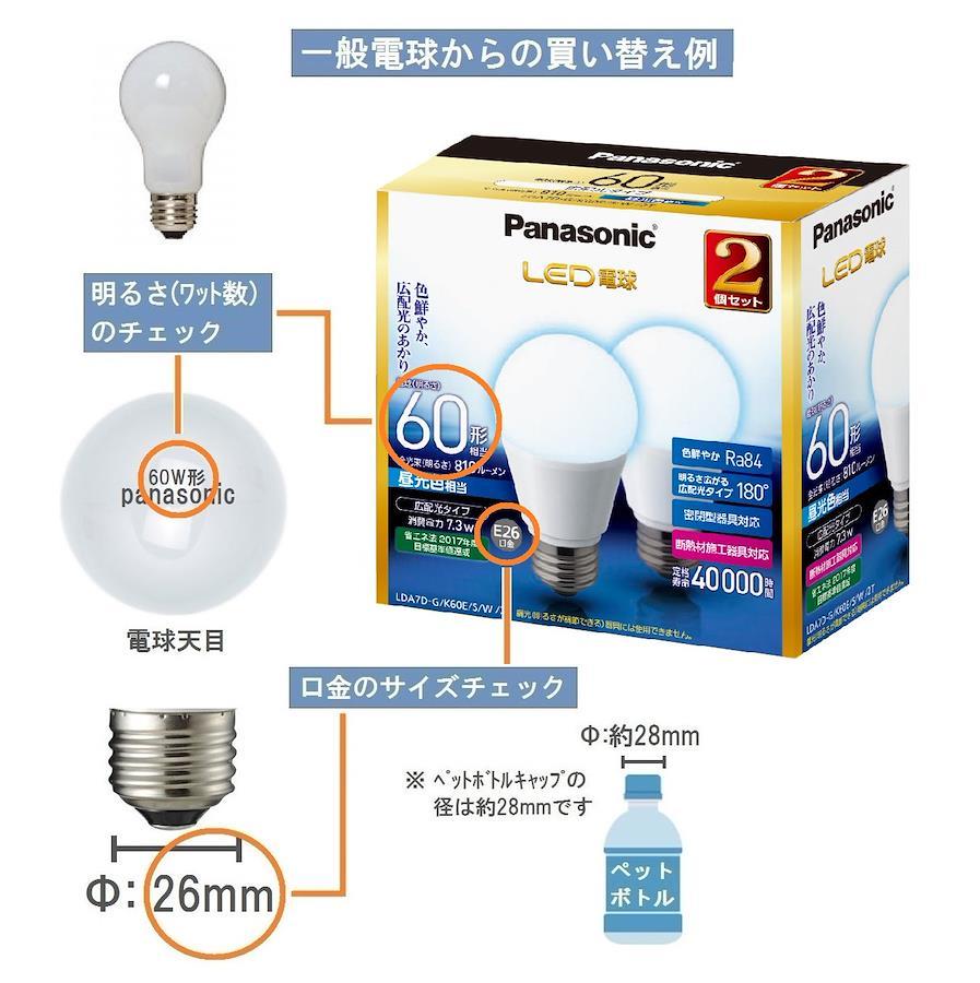 パナソニック LED電球 口金直径26mm 電球60W形相当 昼光色相当(7.3W) 一般電球・広配光タイプ 2個入 密閉形器具対応 LDA7DGK60ESW2T
