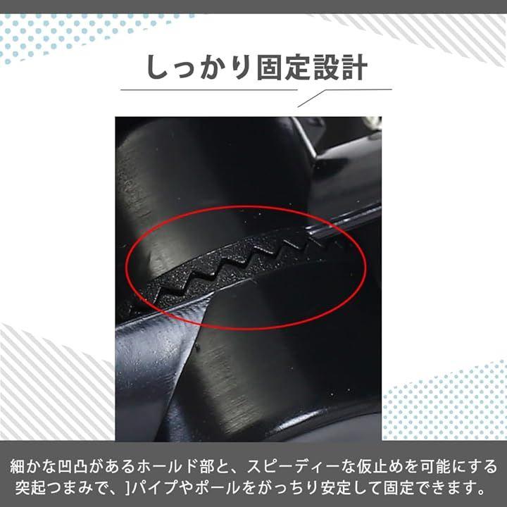 「しっかり固定設計」細かな凹凸があるホールド部と、スピーディーな仮止めを可能にする突起つまみで、パイプやポールをがっちり安定して固定できます。