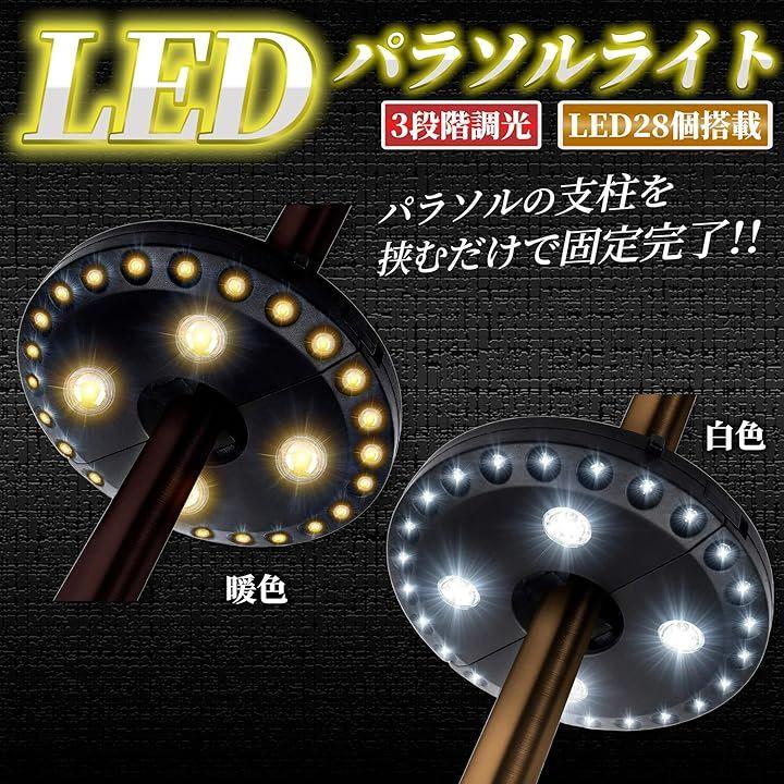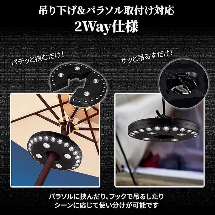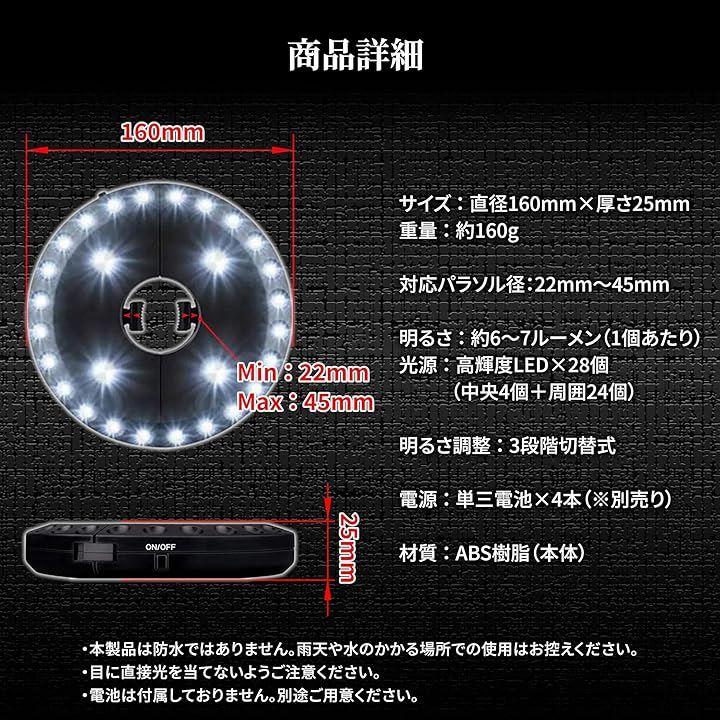 商品仕様 : ・サイズ 直径:約160mm/厚さ:約25mm ・重量 約160g ・材質 ABS樹脂(本体) ・光源 高輝度LEDx28個(中央4個+周囲24個) ・明るさ 約6~7ルーメン(1個あたり) ・明るさ調整 3段階切替式 ・電源 単三電池x4本(*別売り) ・取付方法 クリップ式(パラソル支柱に挟むだけ) ・防水性 防水仕様ではありません(屋外使用可ですが、水濡れにはご注意ください)