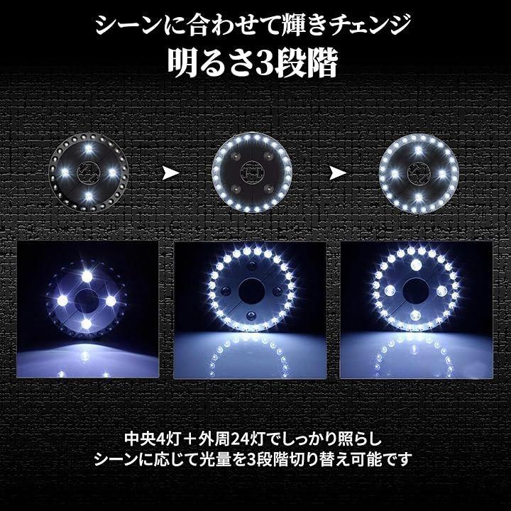 明るさ3段階調整のLED28灯搭載 : 中央4灯+外周24灯でしっかり照らし、シーンに応じて光量を3段階切り替え可能。
