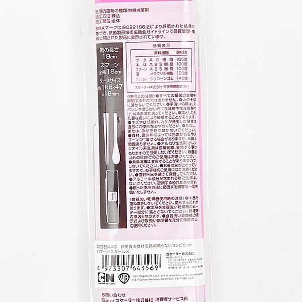 パワーパフガールズのシリコンクッションが付いているので、持ち運びの際にカチャカチャ音が鳴りにくい食洗機対応コンビセットです。使いやすい18cmのお箸とスプーン付きなのでランチタイムなどで大活躍すること間違いなし!可愛いパワパフアイテムで楽しいランチタイムをお過ごしください♪食洗機使用可◎【サイズ】ケース:18.8cm×4.7cm×1.8cm、箸:18cm、スプーン:18cm