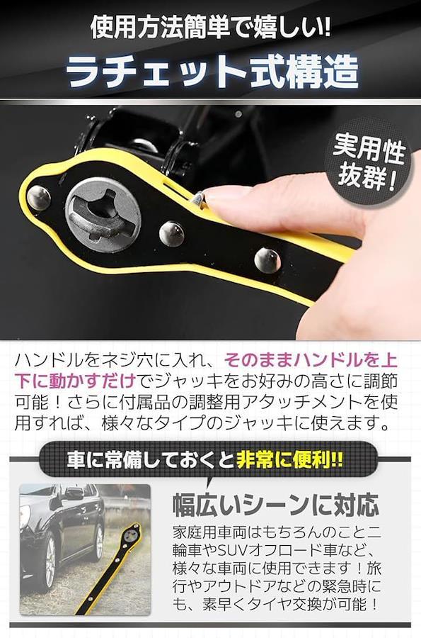 「ラチェット式構造」ハンドルをネジ穴に入れ、そのままハンドルを上下に動かすだけでジャッキをお好みの高さに調節可能。さらに付属品の調整用アタッチメントを使用すれば、様々なタイプのジャッキに使えます。