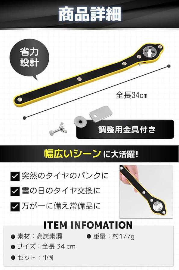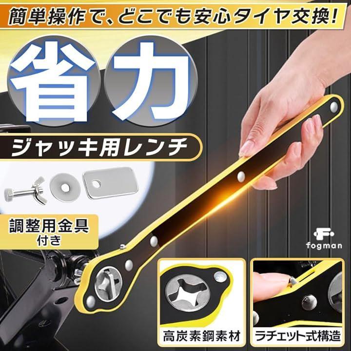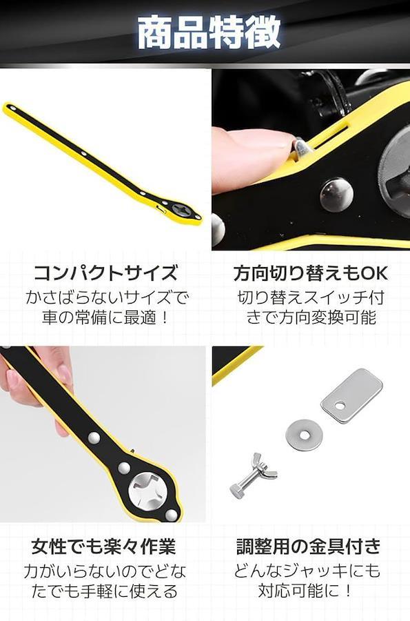 「商品特徴」(1)コンパクトサイズ:かさばらないサイズで車の常備に最適。/(2)方向切り替えもOK:切り替えスイッチ付きで方向変換可能/(3)女性でも楽々作業:力がいらないのでどなたでも手軽に使える/(4)調整用の金具付き:どんなジャッキにも対応可能に。