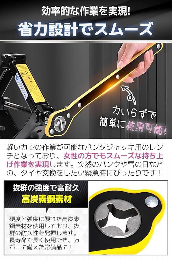 「省力設計でスムーズ」軽い力での作業が可能なパンタジャッキ用のレンチとなっており、女性の方でもスムーズな持ち上げ作業を実現します。