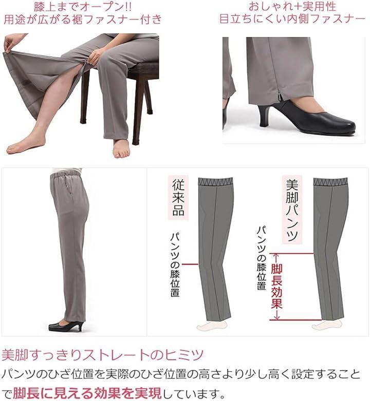 深めの股上にゆったりとしたウエスト、ヒップ周りながらも、シルエットはストレートラインにし、パンツのひざ位置を実際のひざ位置より少し高く設定することで、美脚効果を演出