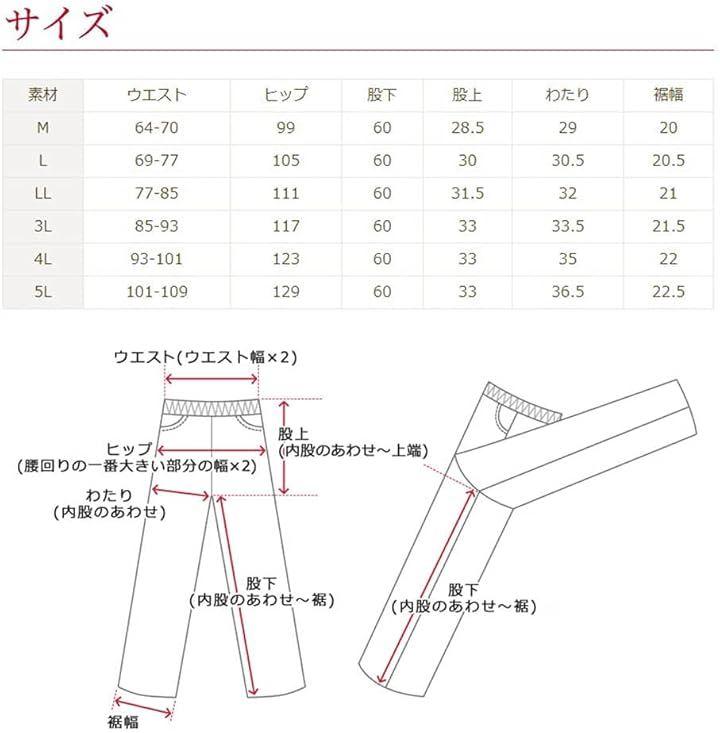 「5Lサイズ」ウエスト101-109cm, 股上33cm, わたり幅36.5cm, ヒップ129cm, 股下60cm, 裾幅22.5cm