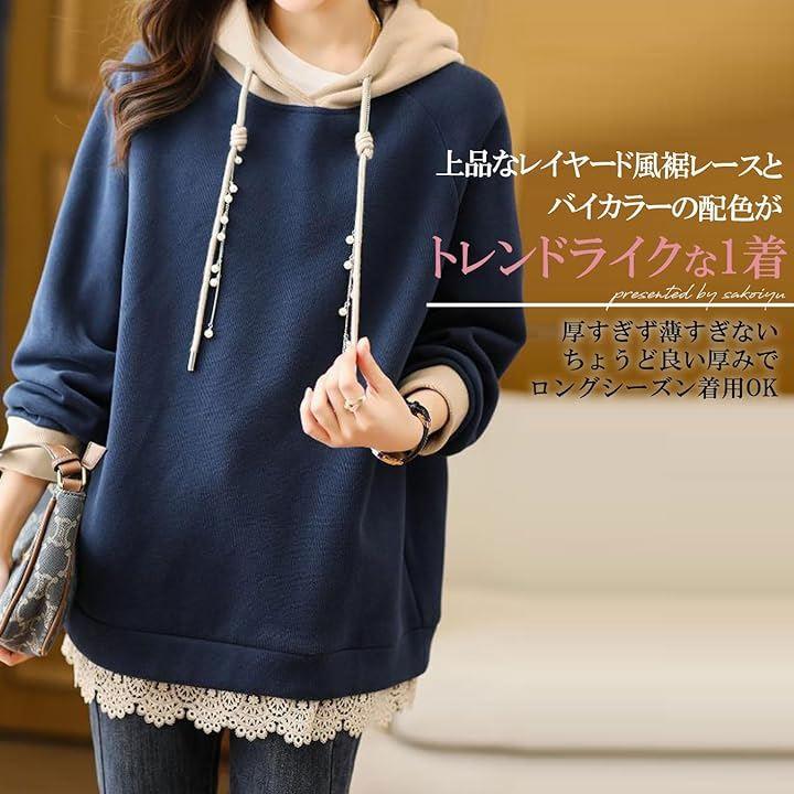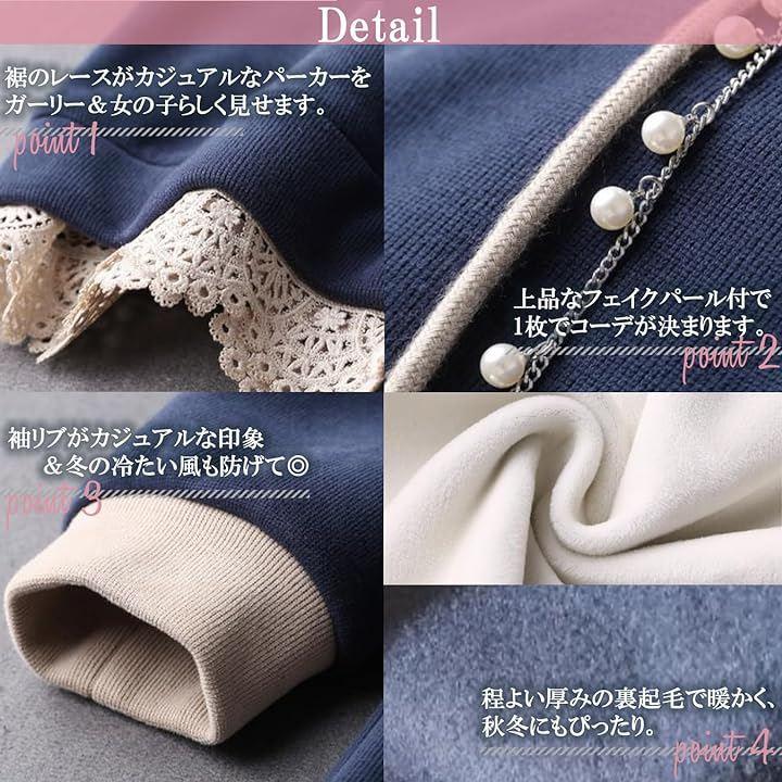 ・裾レース&フェイクパールデザインが、上品かつ大人可愛いレディースプルオーバーパーカー。