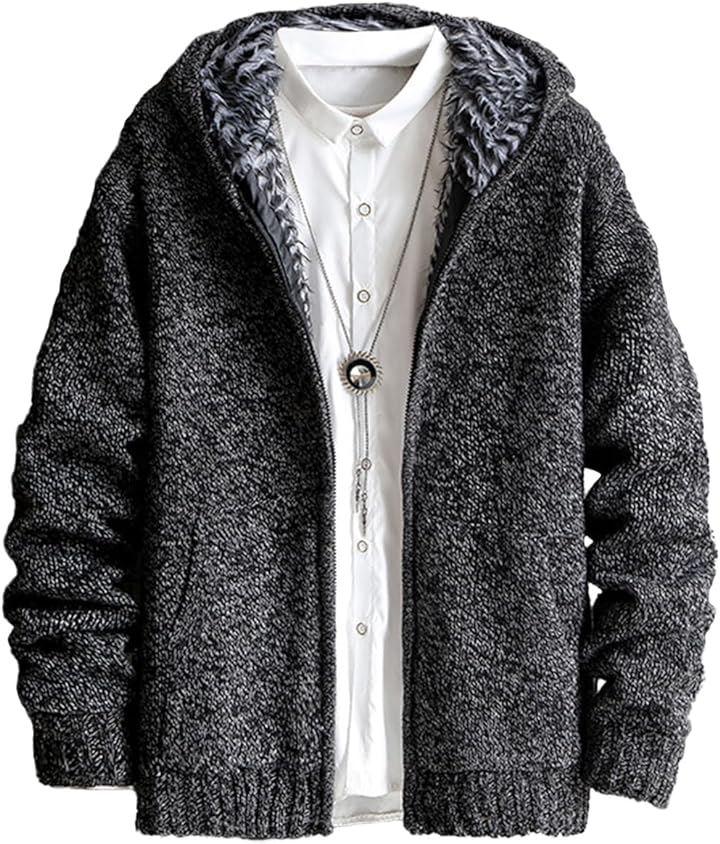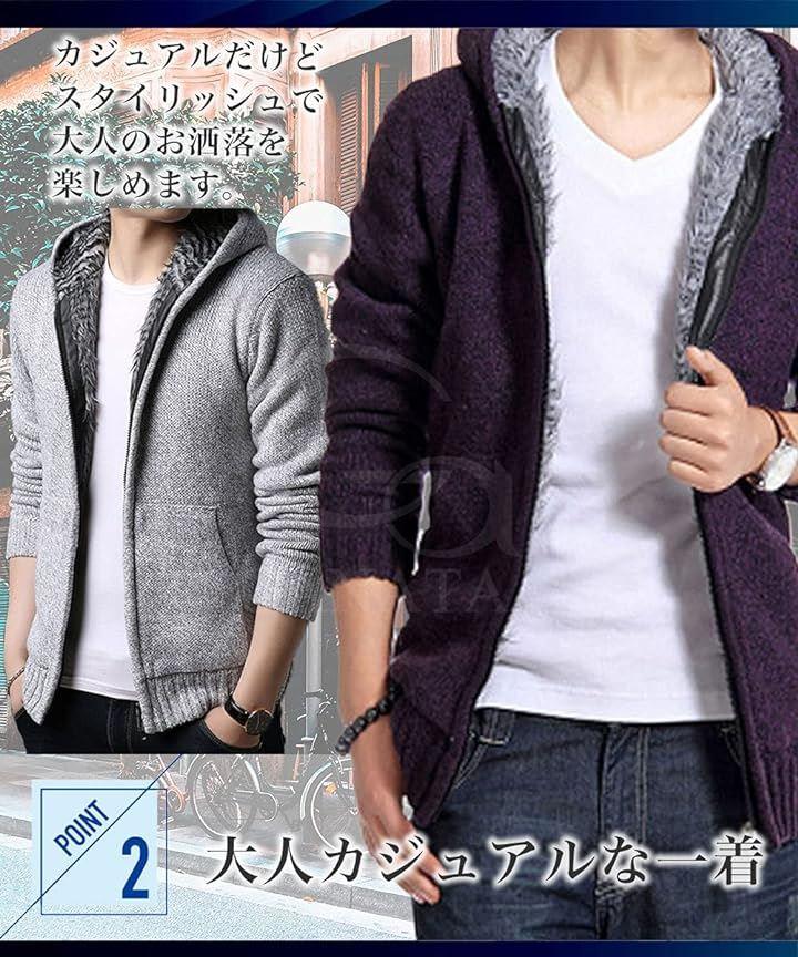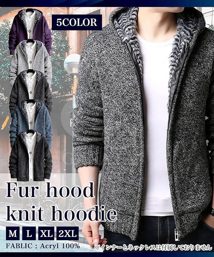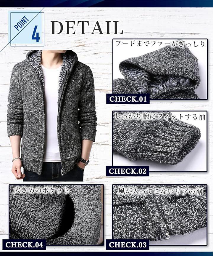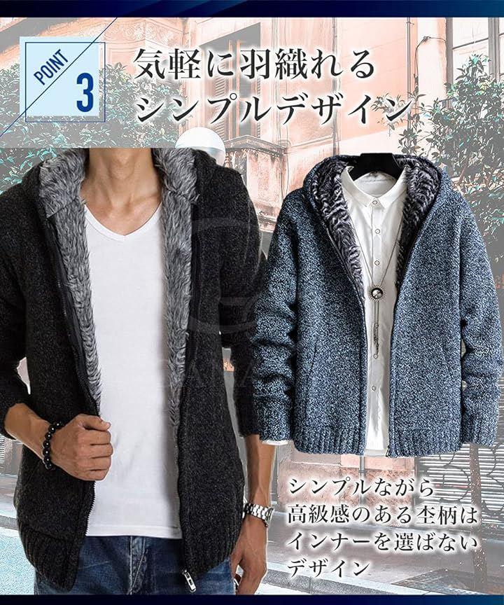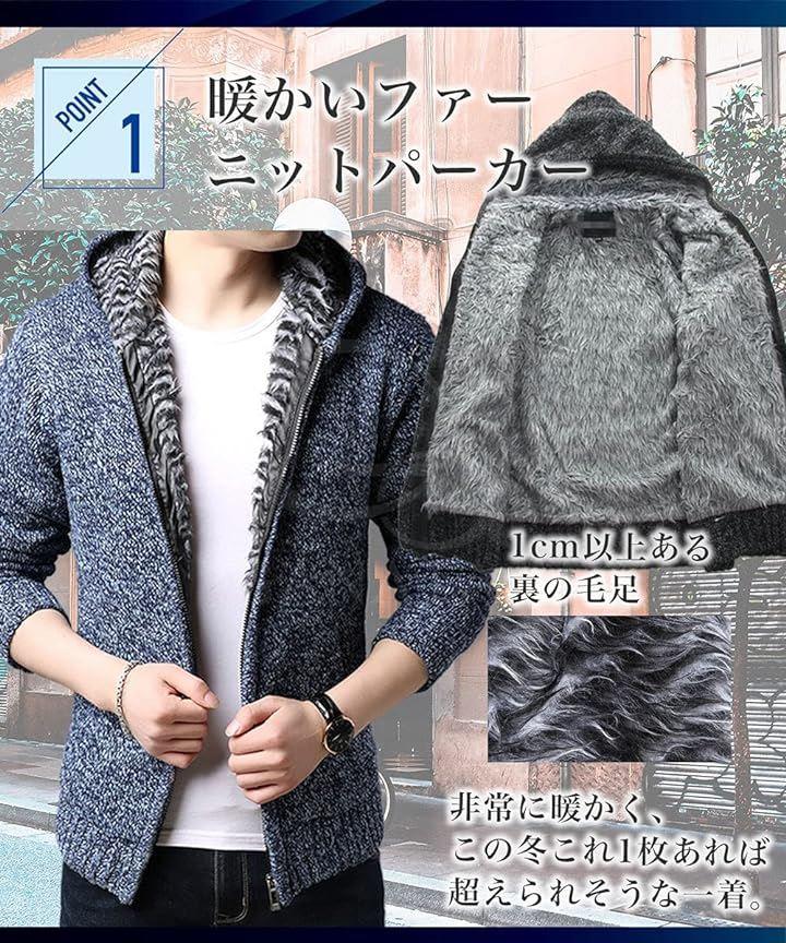 「ニット素材のフルジップパーカーが温かい」表面はニット素材、内側は毛足長めのファーが包み込むように温かい。