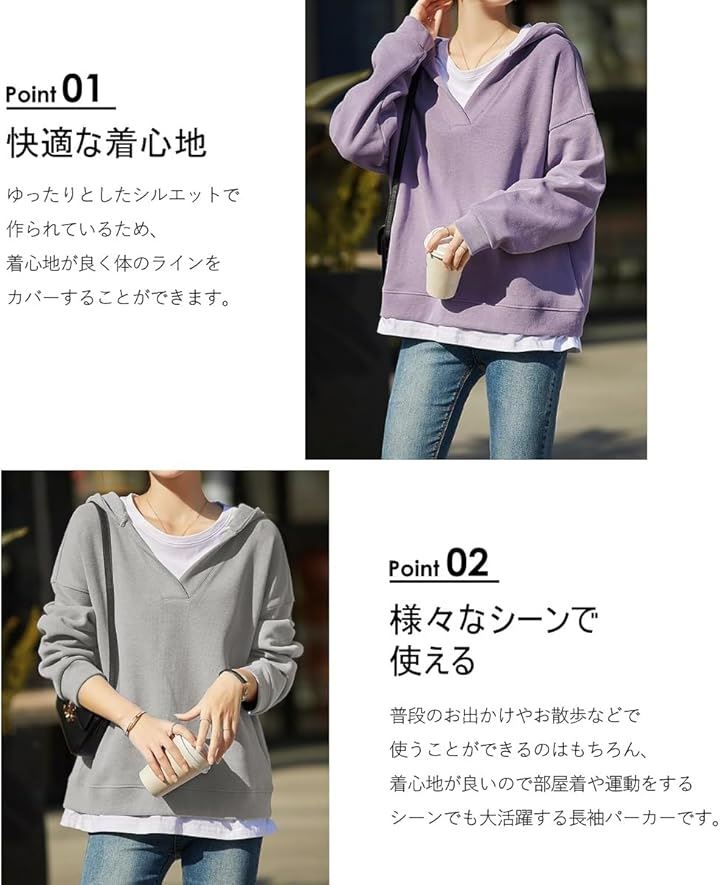 「多くの季節で使えるパーカー」冬にはコートやジャケットなどの上着と合わせることができるのはもちろん、春や秋にはこの1枚でおしゃれを楽しむことができます。