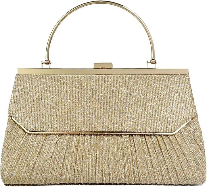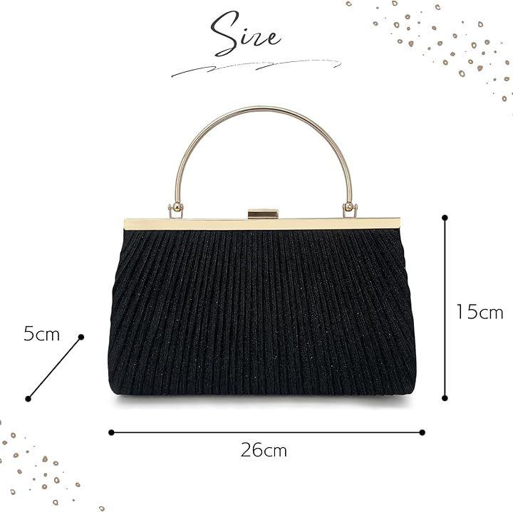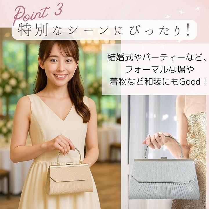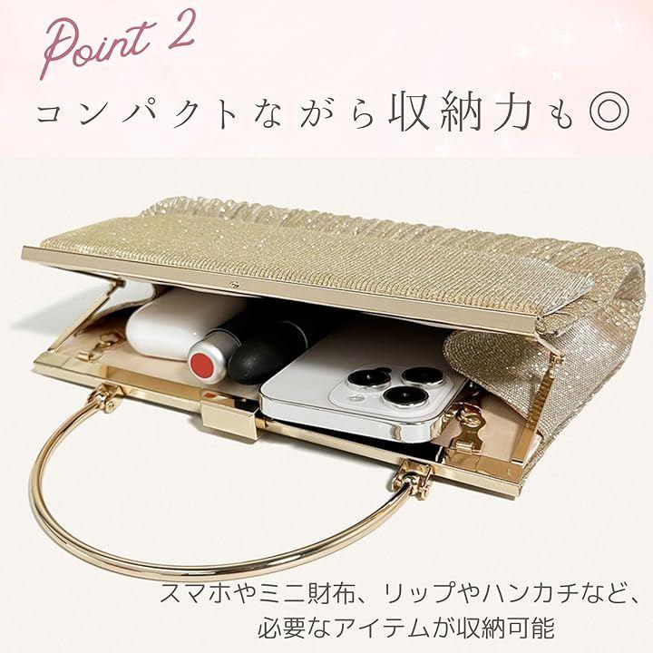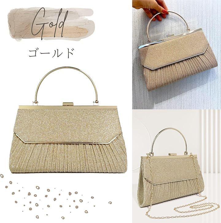 個性的なゴールドフレームに優雅なプリーツにラメ加工が美しくきらめく華やかなパーティーバッグ。