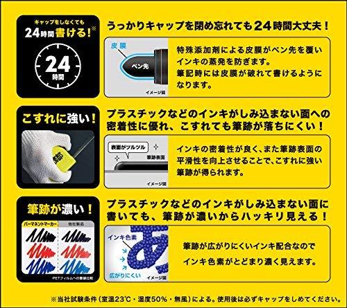 うっかりキャップを閉め忘れても24時間大丈夫。プラスチック等のインクが浸み込まない面への密着性に優れこすれても筆跡が落ちにくい。プラスチック面に書いたとき濃く見える。