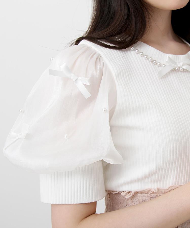 まるでお姫様のようなパフ袖♪ネックレスデザインがかわいいリブカットトップス。