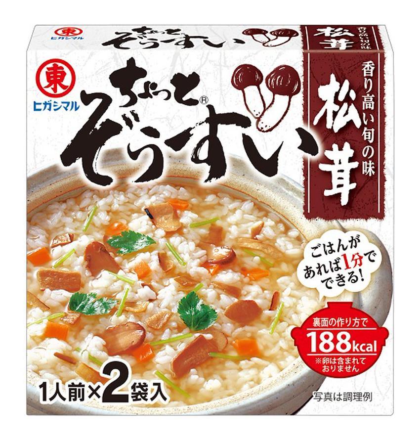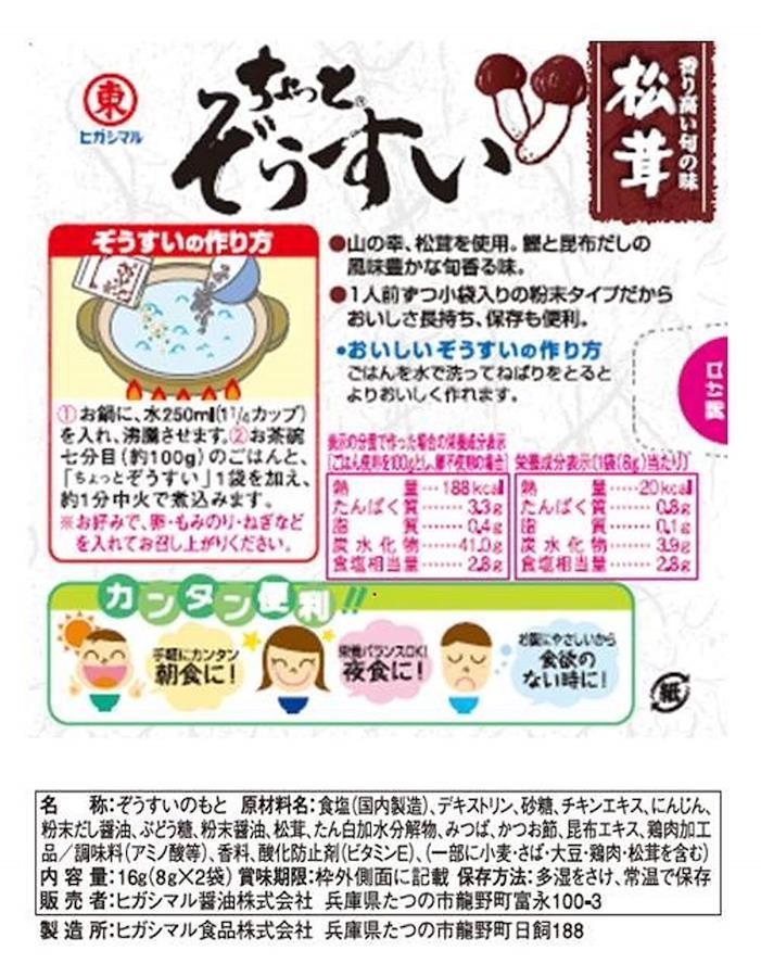 ヒガシマル醤油は天正年間から四百年以上にわたり醤油を造り続けております。当社の淡口醤油は素材の持味を生かすために開発された醤油で濃口醤油はくせのないおだやかなものでしょうゆのうまみを味わえます。また、原料にこだわり、地産地消を地元の契約農家とともにすすめております。ごはんがあれば、素材のうまみにこだわったぞうすいが簡単に出来ます。松茸の香りを活かす、すっきりとしただし味です。